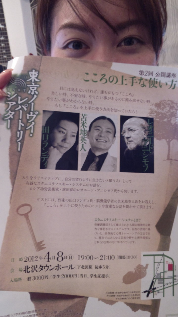 ロシア功労芸術家で世界的な演出家、演技のスタニスラフスキーシステムの最高指導家でもある、レオニード・アニシモフ氏と、作家の田口ランディ氏と私の対談。私自身、スタニスラフスキーシステムは長年研究してきたが、間違いなく演技の理論と実践で最高のシステム。また、演技を超えて人生そのものの演出のシステムでもある。私も何か付加価値の高い話をしたいと思う。